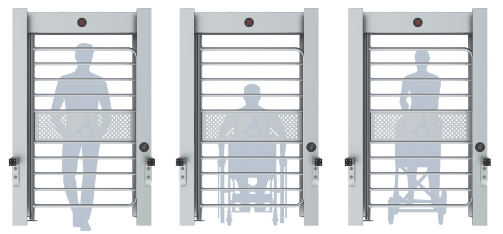 В организациях и на территориях с большим количеством посетителей-инвалидов, людей с колясками, а также на предприятиях, где необходимо обеспечить регулярный пронос крупногабаритных и длинномерных предметов, роторный турникет с полноростовой боковой калиткой шириной 1 метр — оптимальное решение.
