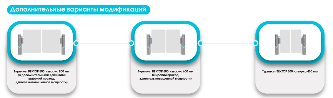 Компактные размеры, простота монтажа и минимальное энергопотребление делают Vector 500 востребованным решением для торговых и бизнес-центров, учебных заведений, промышленных объектов и других территорий, где требуется надёжный контроль доступа. Благодаря увеличенной длине створок до 1180 мм модель обеспечивает более удобный и комфортный проход, что особенно актуально для мест с повышенными требованиями к эргономике.