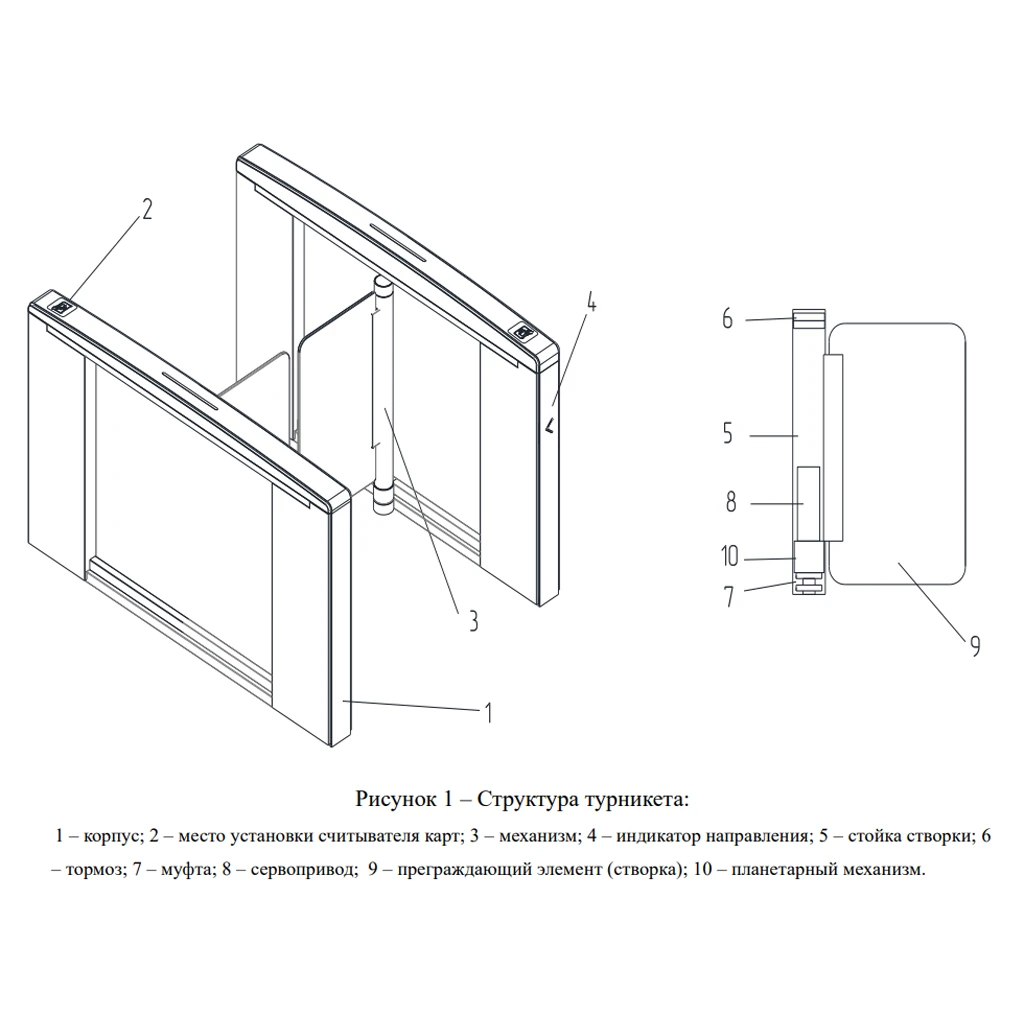 - Створки турникета автоматически разблокируются при отключении питания, что соответствует требованиям пожарной безопасности;