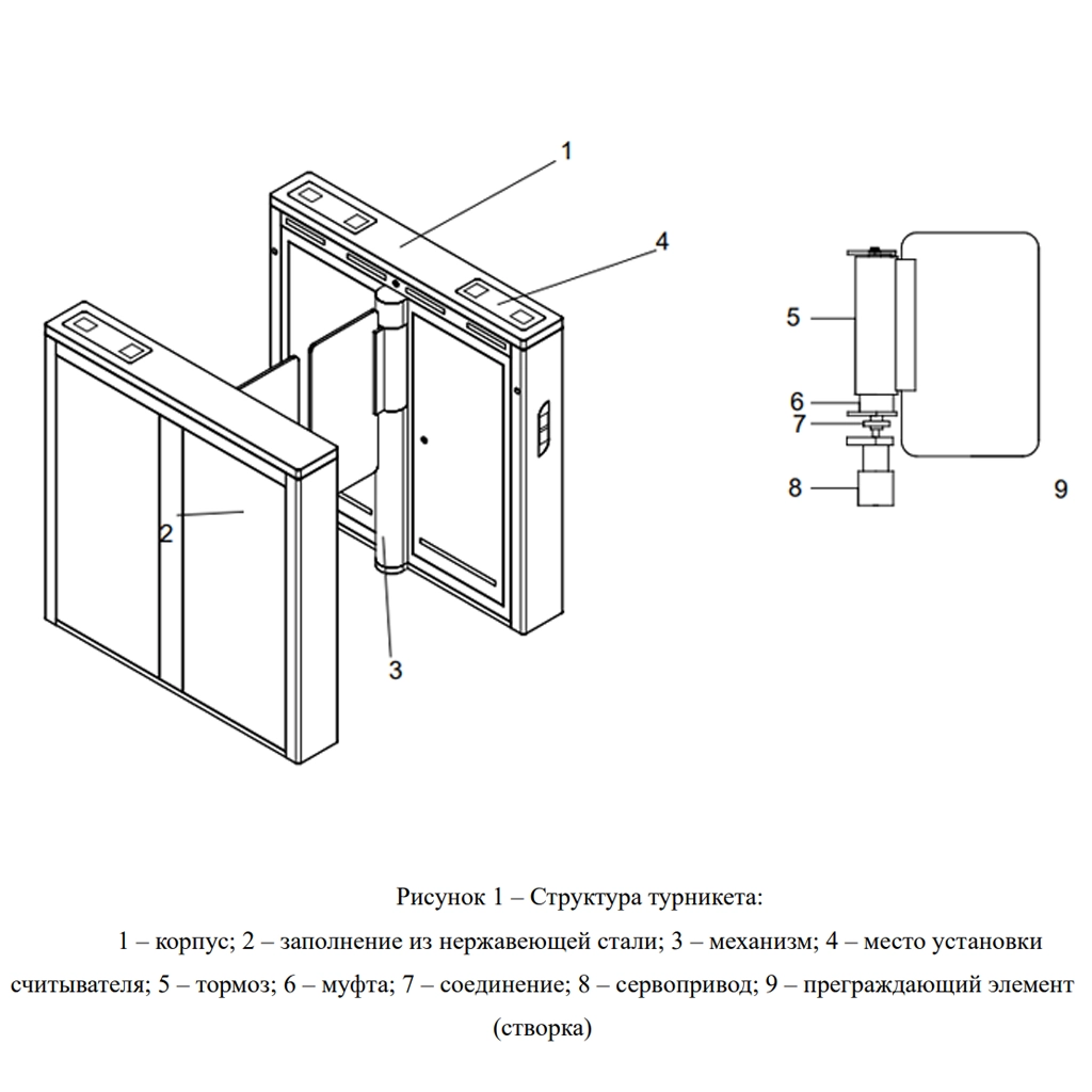 - Створки турникета автоматически разблокируются при отключении питания, что соответствует требованиям пожарной безопасности;