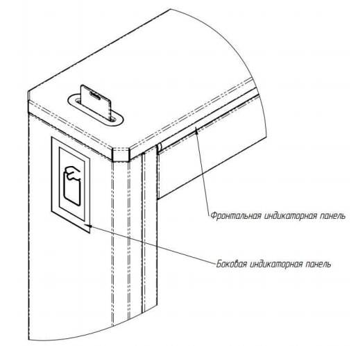 Фронтальная панель индикации турникета расположена в верхней части турникета за вставкой из капролона. Режимы работы турникета отображаются на фронтальной индикаторной панели и дублируются боковыми индикаторными панелями.