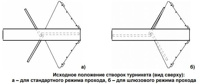 При проходе через турникет в разрешенном направлении и повороте ротора на угол >60º возможность обратного вращения створок ротора блокируется в обеих модификациях исполнительного механизма.