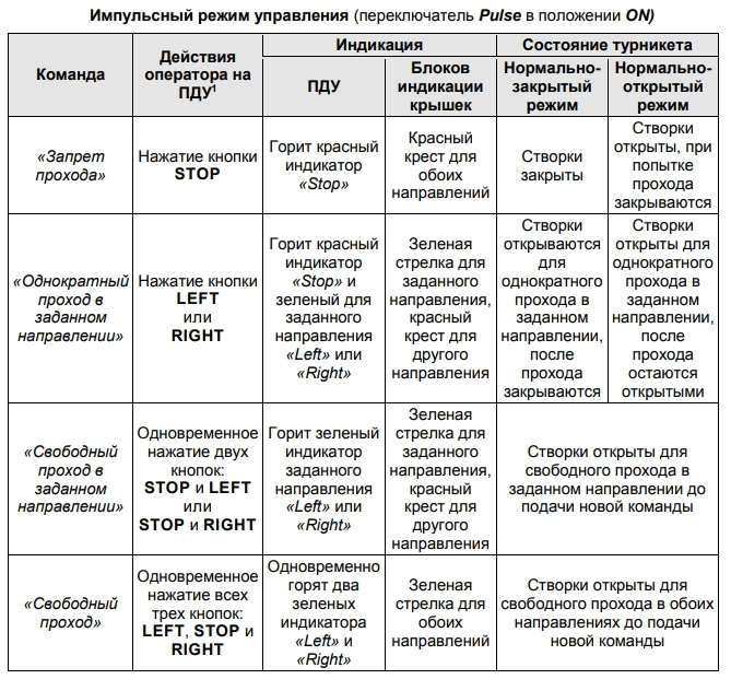 Подача команд управления турникетом и их индикация осуществляется в соответствии с таблицей.