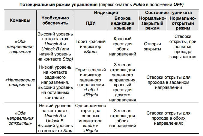 • Турникет поддерживает два режима управления: импульсный и потенциальный.
