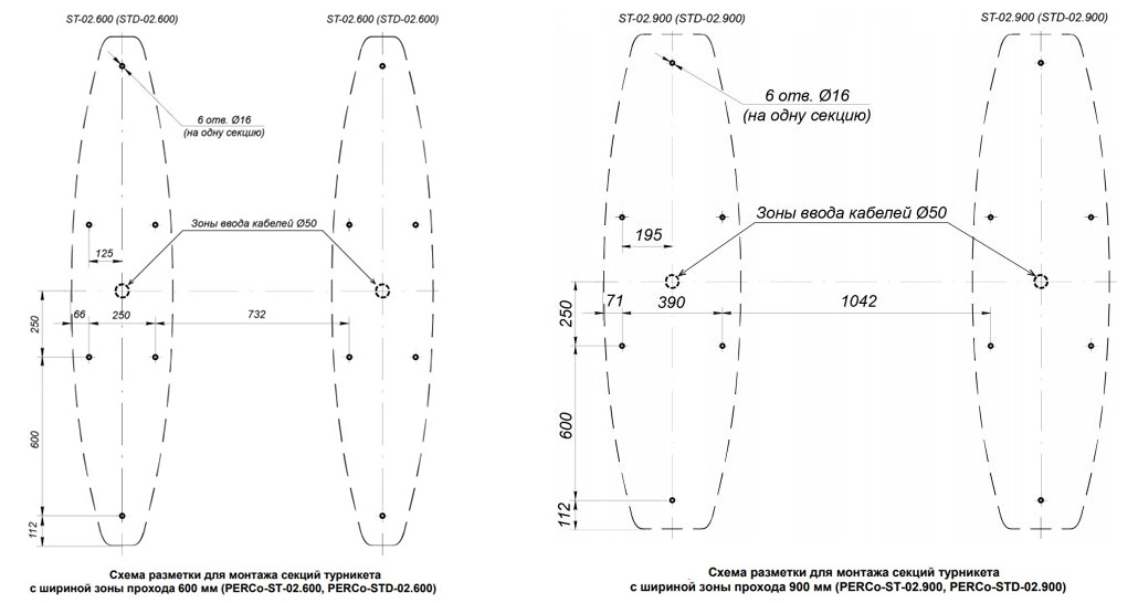 Двусторонняя секция имеет два основных исполнения: PERCo-STD-02.600 для организации зон прохода с шириной 600 мм и PERCo-STD-02.900 для организации зон прохода с шириной 900 мм.