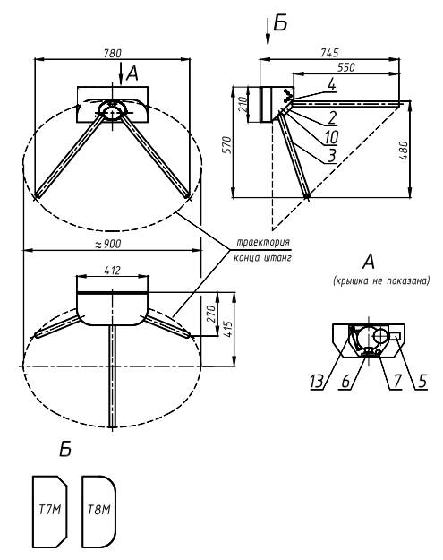 Для доступа к поворотному механизму 2, световым индикаторам 4, электромагниту 5, датчику положения 6, звуковому сигнализатору 7 нужно: в навесном турникете Т8М1 снять кожух 10, открутив 2 винта; в турникете Т9М1 снять кожух 11, повернув оси прижимов 14 освобождая зацепы на крышке, в турникете Т2ММ1 – снять верхнюю крышку 11, открутив два винта, и затем выдвинуть вверх заднюю крышку 12.