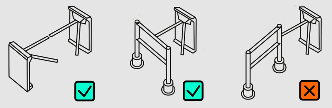 Преграждающие планки-антипаника предназначены для оперативного освобождения прохода в качестве дополнительной меры по обеспечению эвакуации, а также для проноса крупногабаритного груза. Рекомендуется кратковременная эксплуатация турникета при открытом положение преграждающих планок.