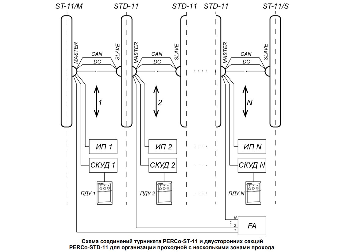 • При необходимости количество зон прохода через турникет может быть увеличено установкой двусторонних секций PERCo-STD-11.