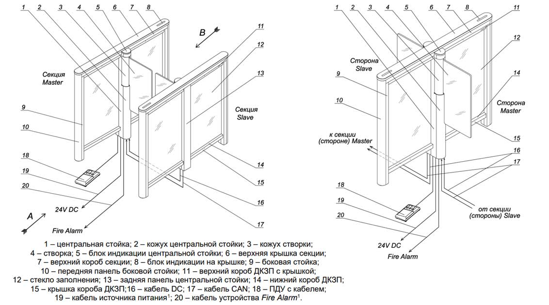 Турникет состоит из двух секций PERCo-ST-11/M (секция Master) и PERCo-ST-11/S (секция Slave).