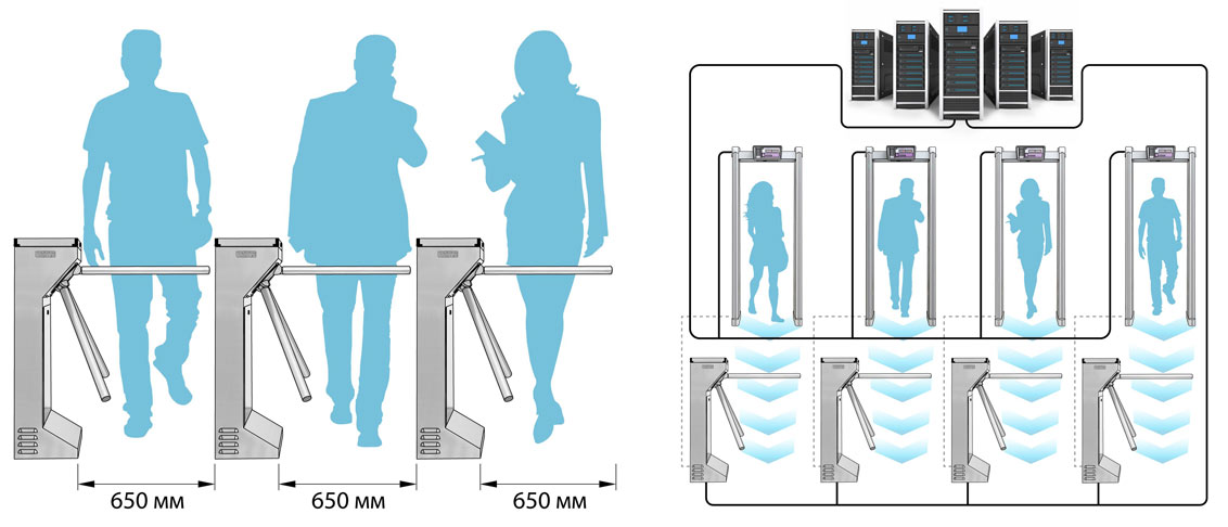 Количество турникетов, необходимое для комфортного обеспечения одиночного прохода людей рекомендуется определять исходя из пропускной способности турникета. Для данных моделей, ориентировочно, в течении 20 минут, из расчета 500 человек на один турникет